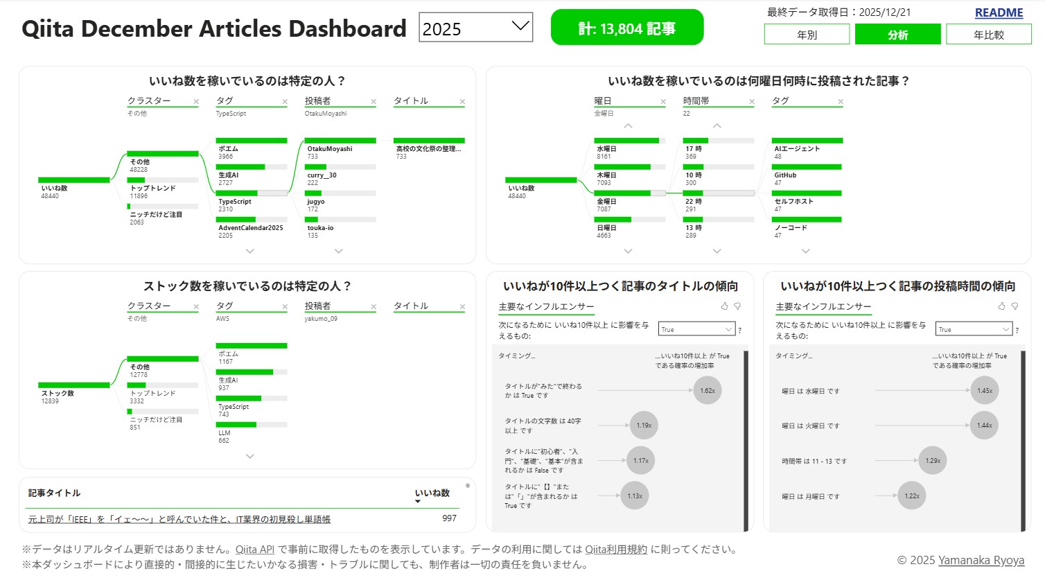 前置きが長くなりましたが、そんな初学者が勉強として 12月(アドベントカレンダー期間)のQiita投稿記事を可視化 してみようと思います。
