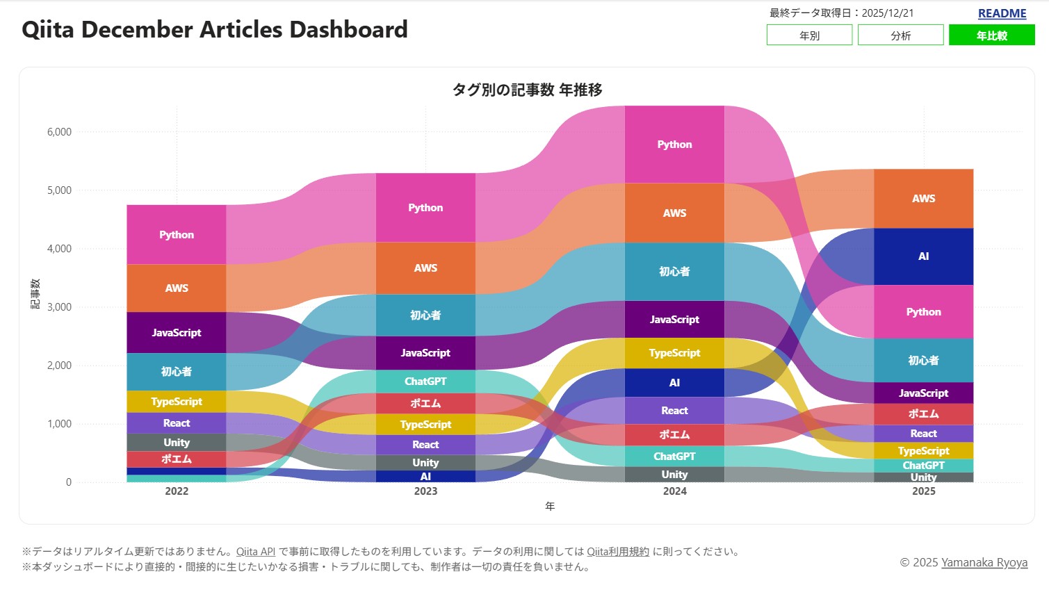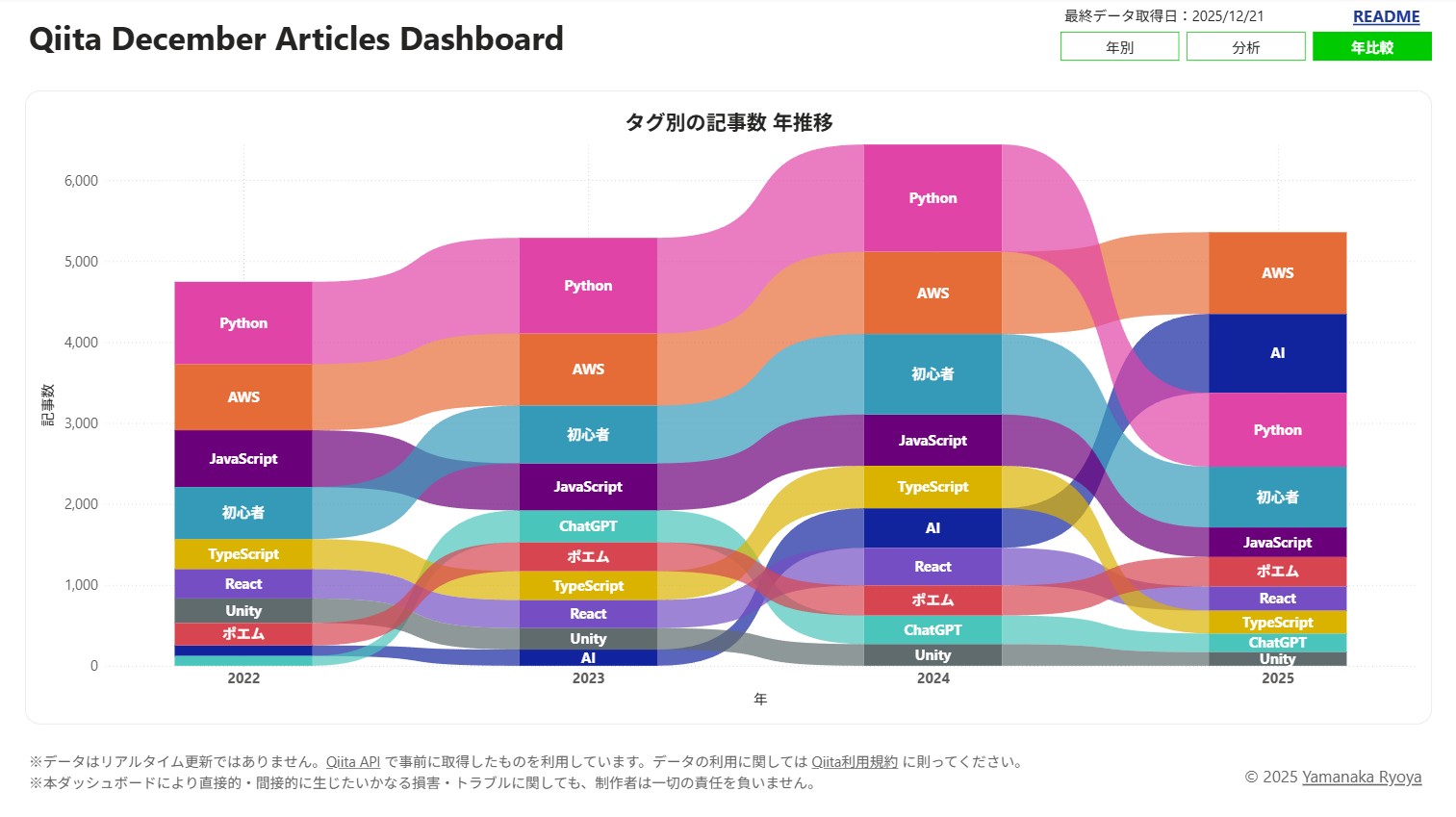 2022年から2025年のそれぞれ12/1〜12/25(2025年のみ12/21取得時点まで)に投稿された記事を取得しています。