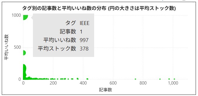 右に行くほど記事数が多いタグ=人気なタグ、左上に行くほどニッチだけど話題になっているタグと読み取れます。