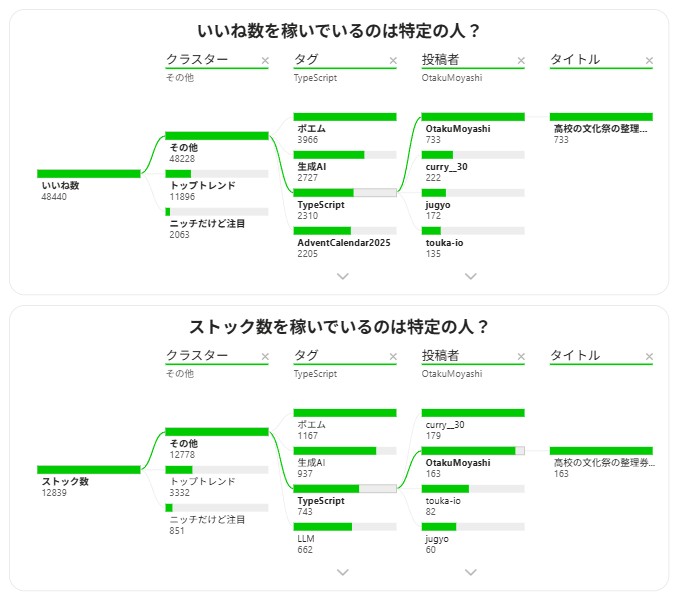 - 分解ツリー:ストック数をクラスター、タグ、投稿者、タイトルで分解していきます。